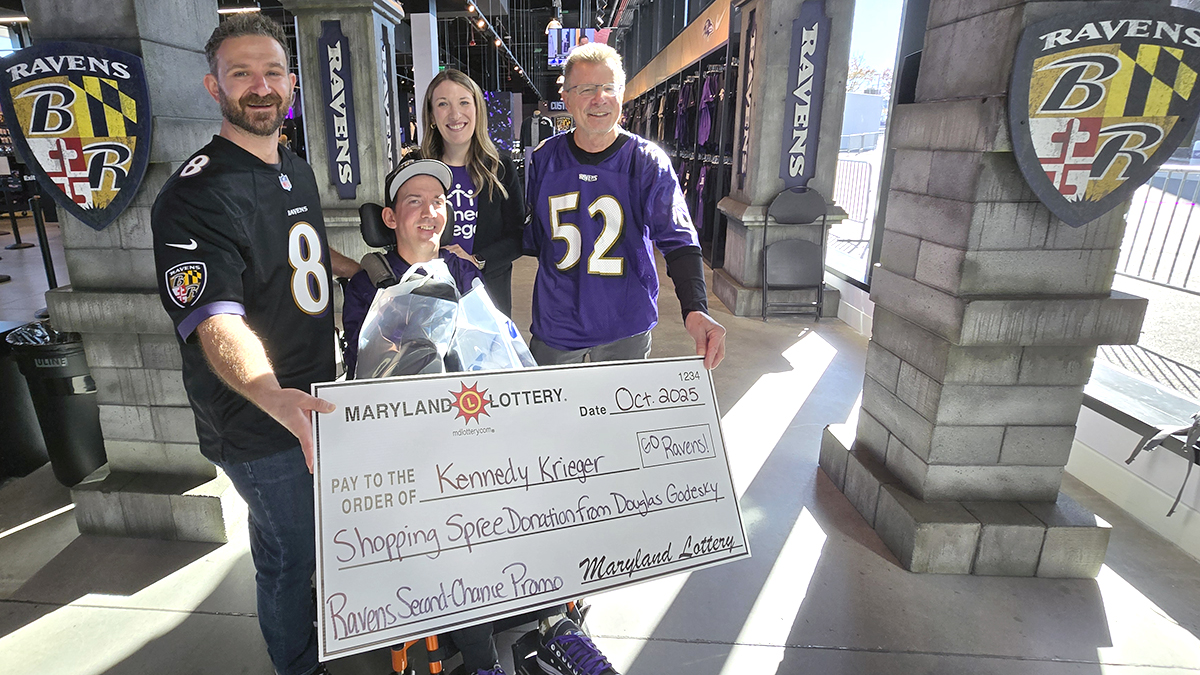 Douglas Godesky (right) donated his Maryland Lottery Ravens shopping spree prize to Kennedy Krieger patient Kevin DiLegge.