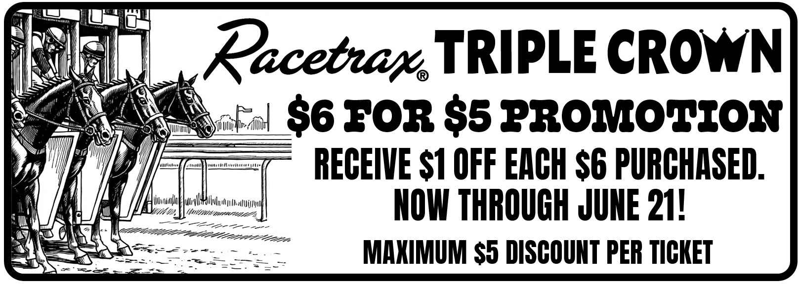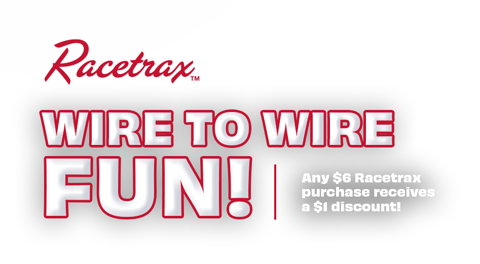 Want even more reasons to play? Now through June 21st, 2026, ANY $6 Racetrax® purchase will receive a $1 discount! The maximum discount you can receive is $5 on any ticket valued at $30 or more.